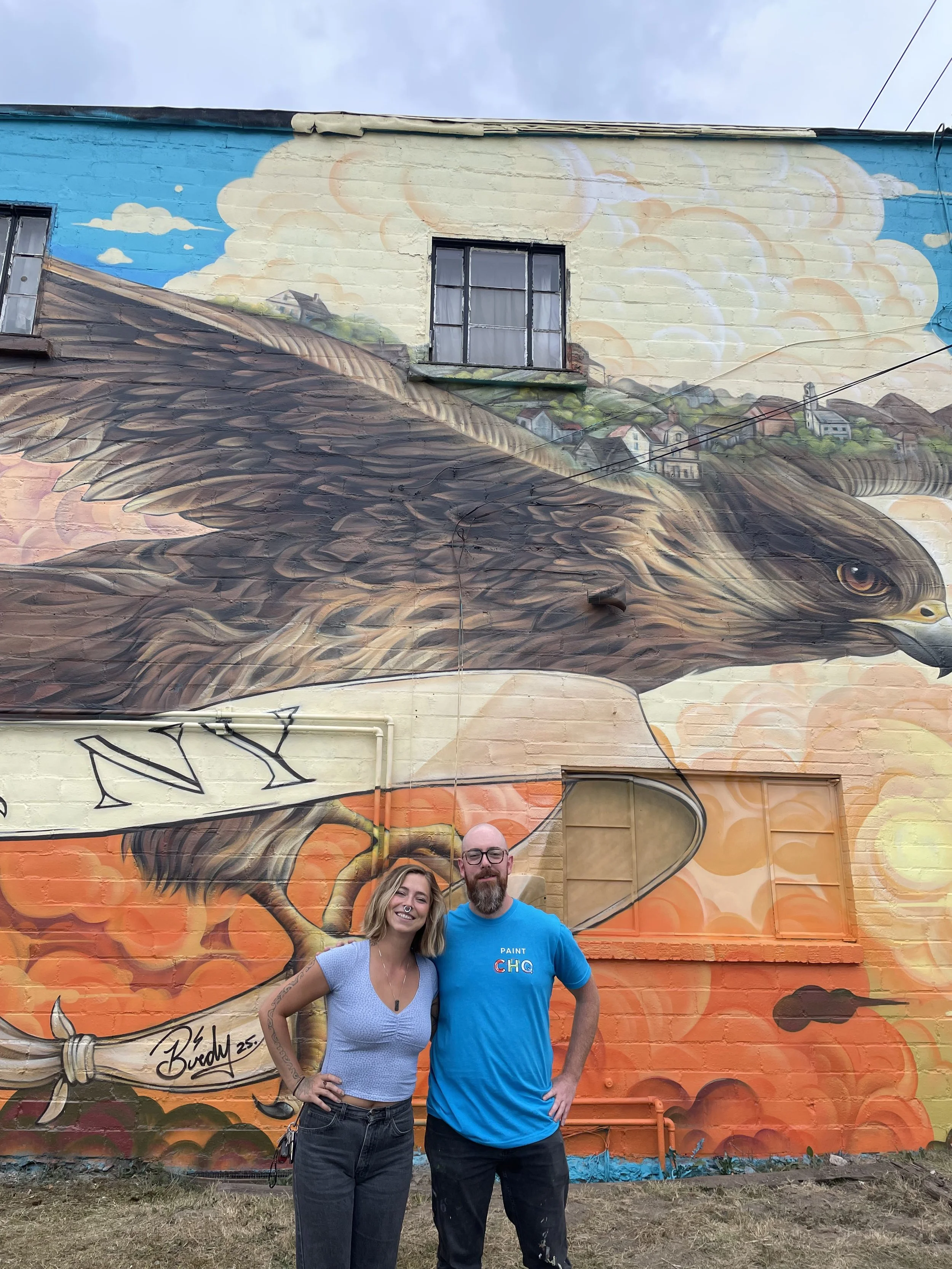 In September, Miss Birdy came to Falconer NY to paint the side of a bowling Alley located between the main intersection of Falconer and the public school. Mandy’s mural depicts a falcon carry’s the town’s aspirations on its back to new heights, it also has a section that harkens back to Falconer’s founding featuring a historical rendering of Falconer’s first Furniture and Sawmill. Mandi asked me and my friend and fellow artist Melissa Meyer to paint the historical rendering while she focused on the Falcon. It was an honor to be trusted to help realize the town’s and Mandi’s vision of historic Falconer. We even tied in some hidden Easter eggs referencing a moment in Falconer’s past nearly 100 years ago when a travellining Circus visited and their elephants escaped their enclosures and made their way down Main St.
