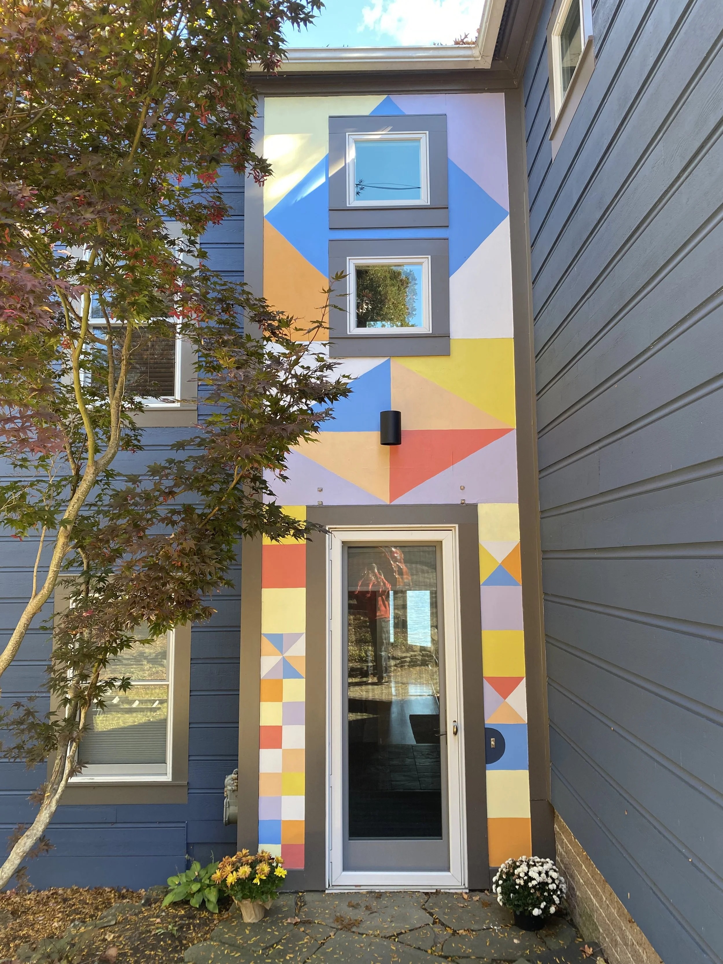 In October, my close friend Sarah was hired to paint an exterior mural on a private residence in the Chautauqua Institution. The mural was designed to highlight the house’s entryway with brightly colored geometric patterns by Sarah. She asked me to help her complete some of the painting work on the second story as the terrain was difficult to anchor a ladder without help. Sarah is a close friend, so when she asked for my help, of course I jumped at the opportunity to assist.