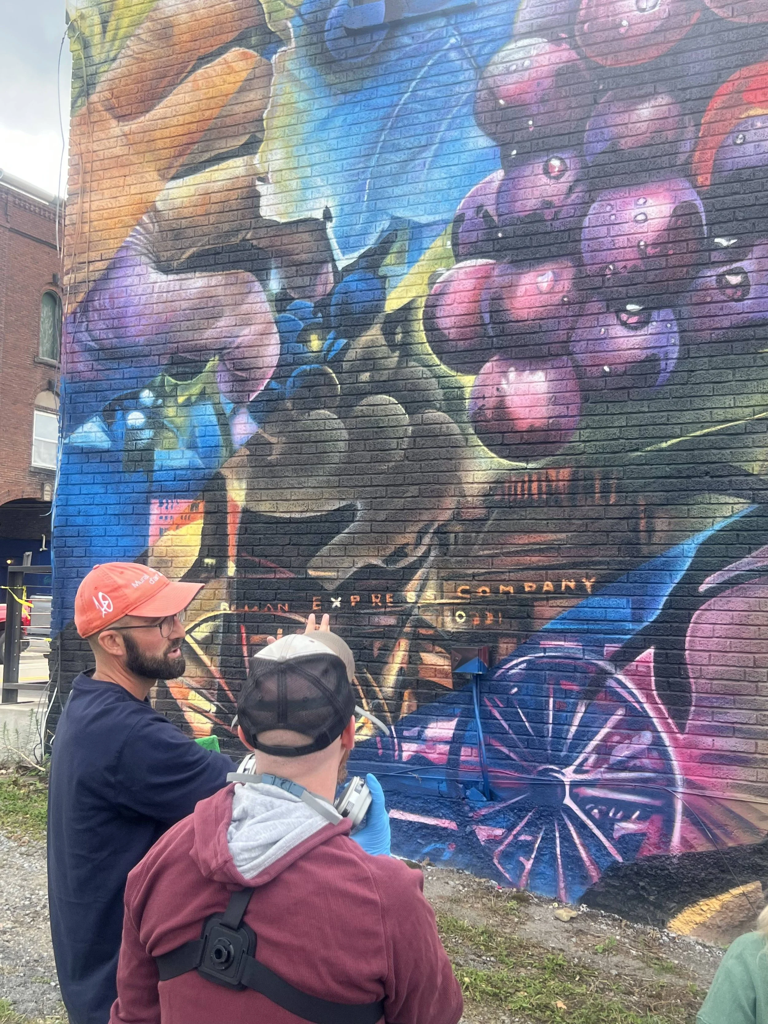 During September, Dominic and Anais of Drift Mural installed a mural in Westfield right near the main Intersection highly visibile if you are coming into town from Route 5 or Barcelona. The colorful mural is dedicated to the rich agricultural and wine making region that surrounds this section of Lake Erie. I helped Dominic paint a small section of grape leaves on this beautiful mural and I’m forever grateful for the opportunity to learn from the accomplished Duo.